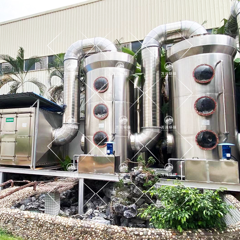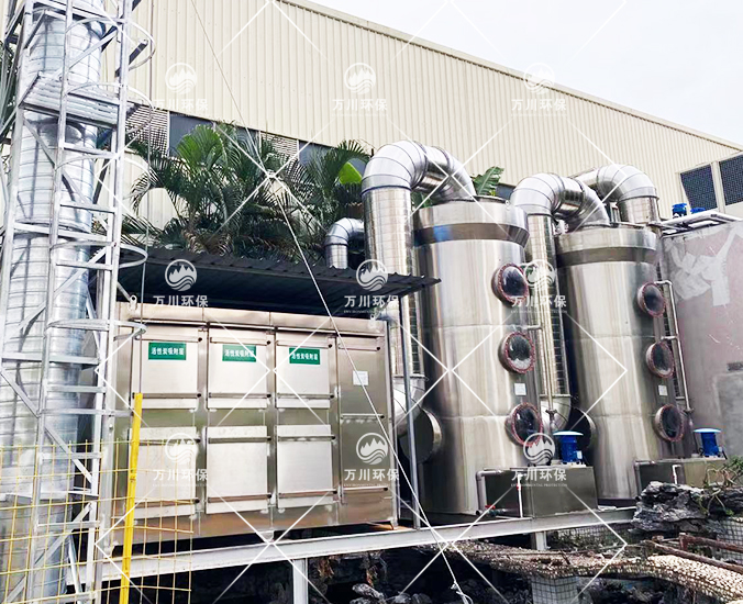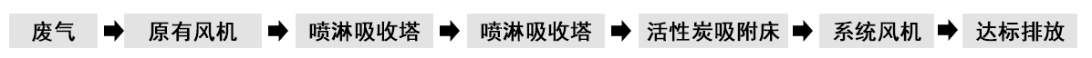 根據(jù)客戶需求和我司實(shí)地考察之后,最終采用‘兩級(jí)噴淋吸收法+活性炭吸附法’對(duì)其進(jìn)行處理。采用水噴淋一方面可以降溫,另一位方面能夠讓水吸一部分的有機(jī)廢氣,降低后續(xù)活性炭吸附的負(fù)荷。
