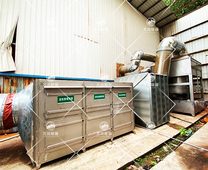 有機廢氣凈化流程:由于噴漆廢氣中含有一定的顆粒物,因此首先進到水簾柜和噴淋塔在進一步除去顆粒物和水溶性物質,而后進入到除霧器,過濾未完全凈化水分,而后進入活性炭吸附,該法具有處理效果高,運行穩定優點。