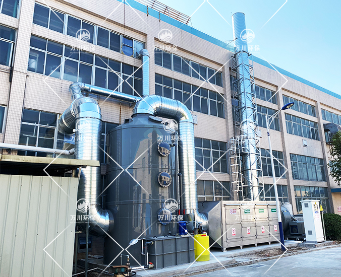 廢氣和粉塵經過集氣罩吸入至風管,以負壓的形式進入到噴淋吸收塔內,廢氣和粉塵進入塔內,塔內噴出吸收液,吸收液在填料層液膜,廢氣和粉塵充分地與液膜接觸,處理后的氣體經過塔頂的除霧層干燥后,可以直接排放或者進入后續(xù)的廢氣處理設備中進行處理。